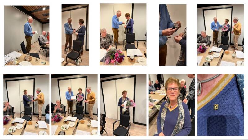Ria is 10 jaar vrijwilliger en wordt door de voorzitter toegesproken op de vergadering. Er wordt haar een beeldje, speldje, oorkonde en een boeket bloemen met de felicitaties aangeboden. Ria bedankt voor jouw inzet.